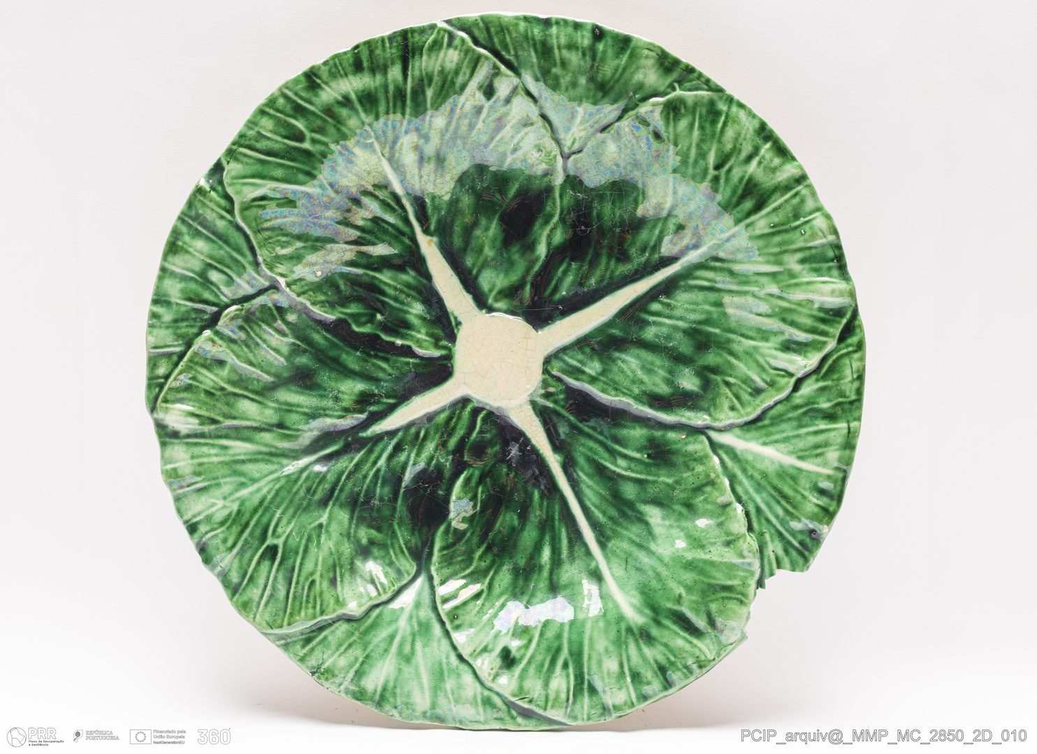 Matéria/Técnica: Barro branco moldado e modelado. Vidrado polícromo: verdes e branco; Cronologia: 1862-1901; Autoria: José Alves Cunha / Fábrica de José Alves Cunha, Caldas da Rainha, Portugal; Dimensões (cm): Altura: 25; Largura: 27.