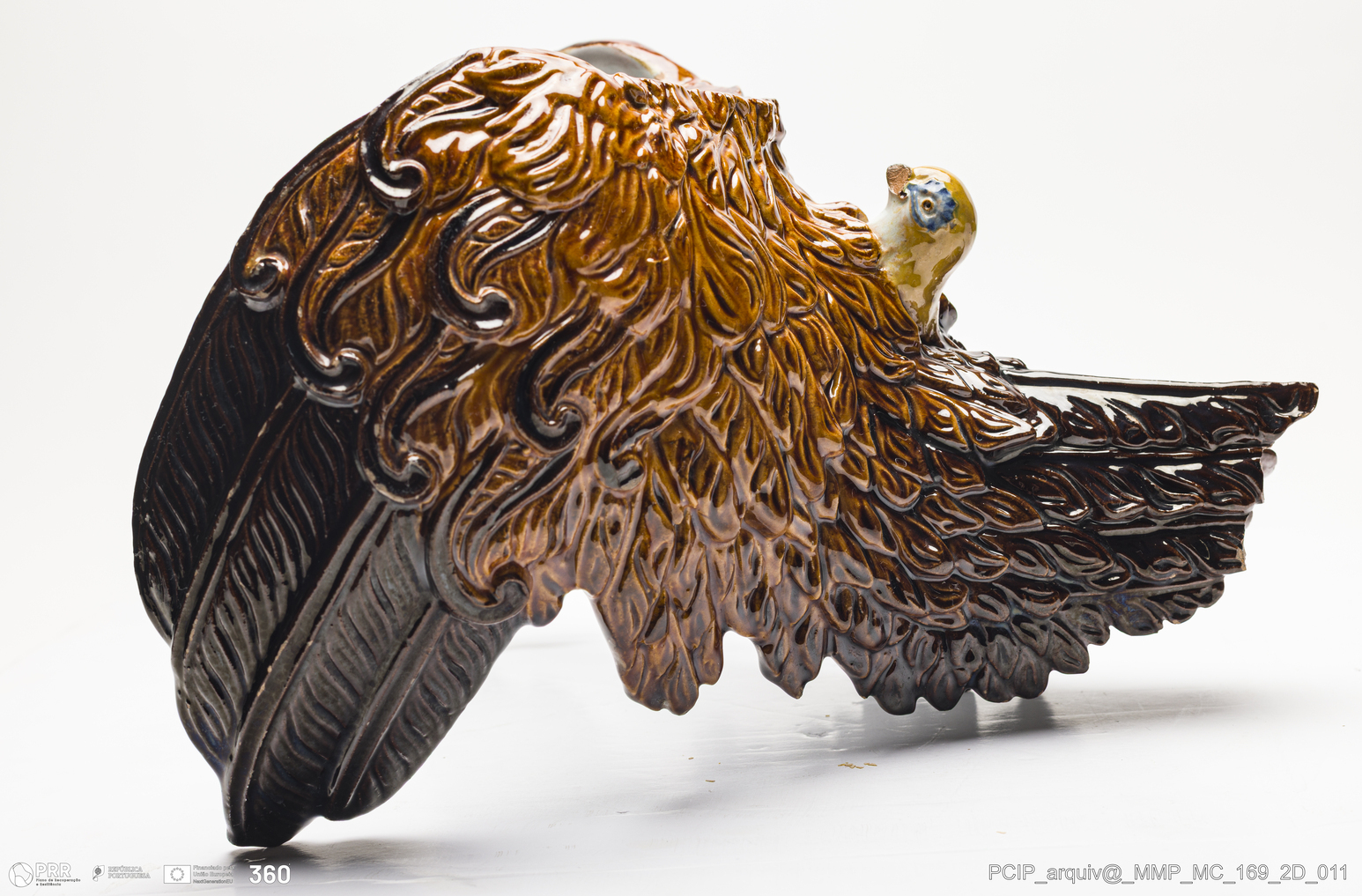 Matéria/Técnica: Barro branco moldado. Vidrado polícromo: preto, vermelho, castanho escuro e mel, branco e verde; Cronologia: 1906; Autoria: Manuel Gustavo Bordalo Pinheiro / Fábrica de Faianças das Caldas da Rainha; Dimensões (cm): Altura: 34,5; Largura: 31,5; Comprimento: 27.