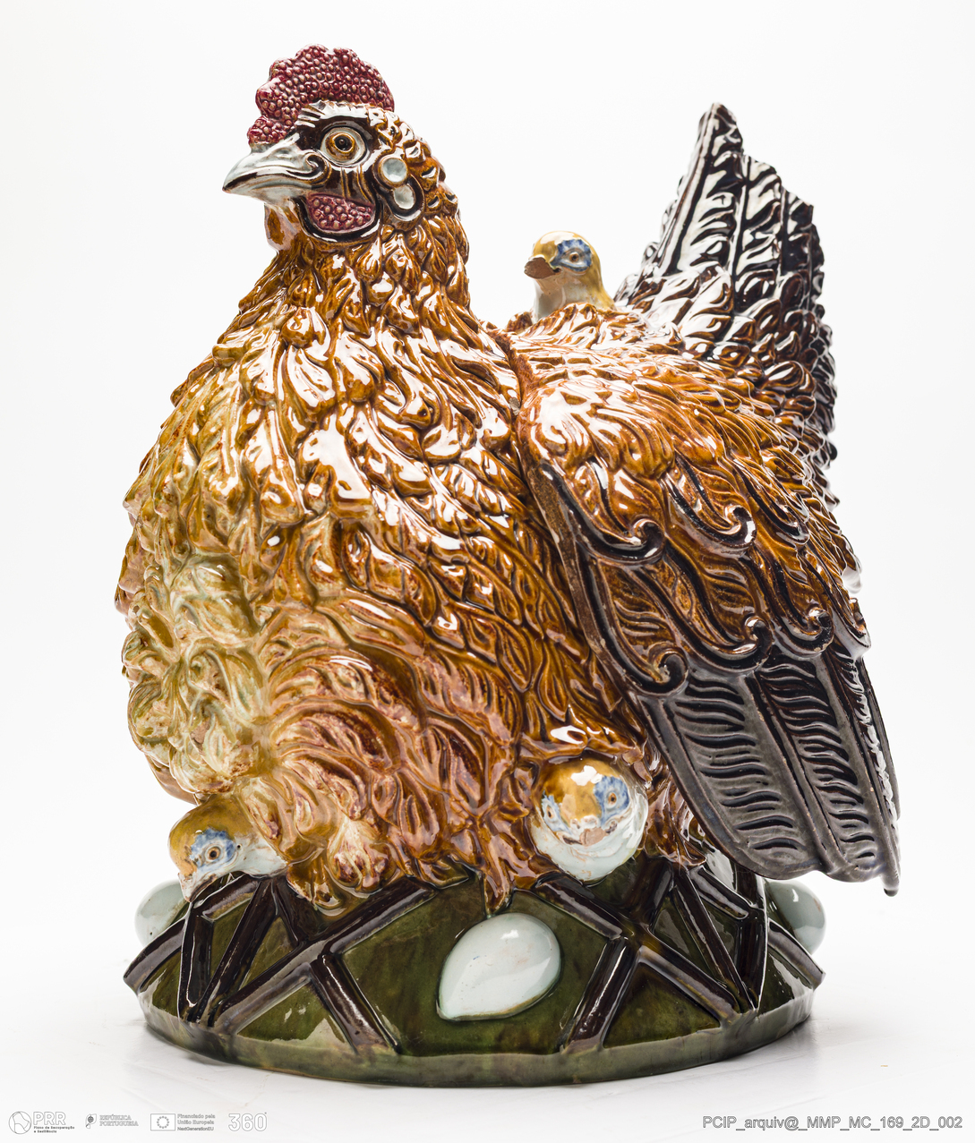 Matéria/Técnica: Barro branco moldado. Vidrado polícromo: preto, vermelho, castanho escuro e mel, branco e verde; Cronologia: 1906; Autoria: Manuel Gustavo Bordalo Pinheiro / Fábrica de Faianças das Caldas da Rainha; Dimensões (cm): Altura: 34,5; Largura: 31,5; Comprimento: 27.