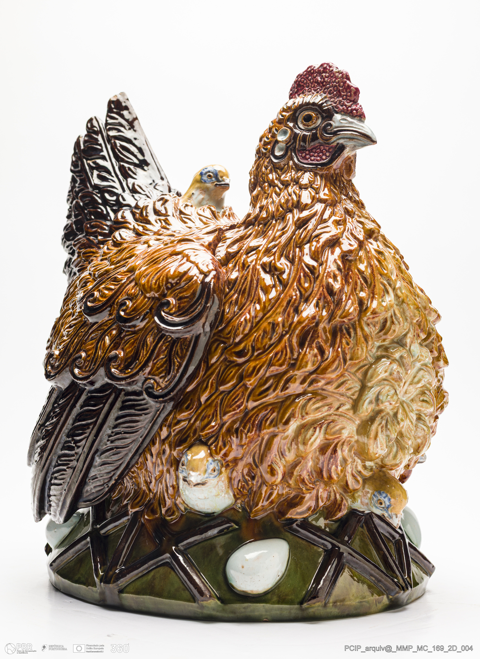 Matéria/Técnica: Barro branco moldado. Vidrado polícromo: preto, vermelho, castanho escuro e mel, branco e verde; Cronologia: 1906; Autoria: Manuel Gustavo Bordalo Pinheiro / Fábrica de Faianças das Caldas da Rainha; Dimensões (cm): Altura: 34,5; Largura: 31,5; Comprimento: 27.