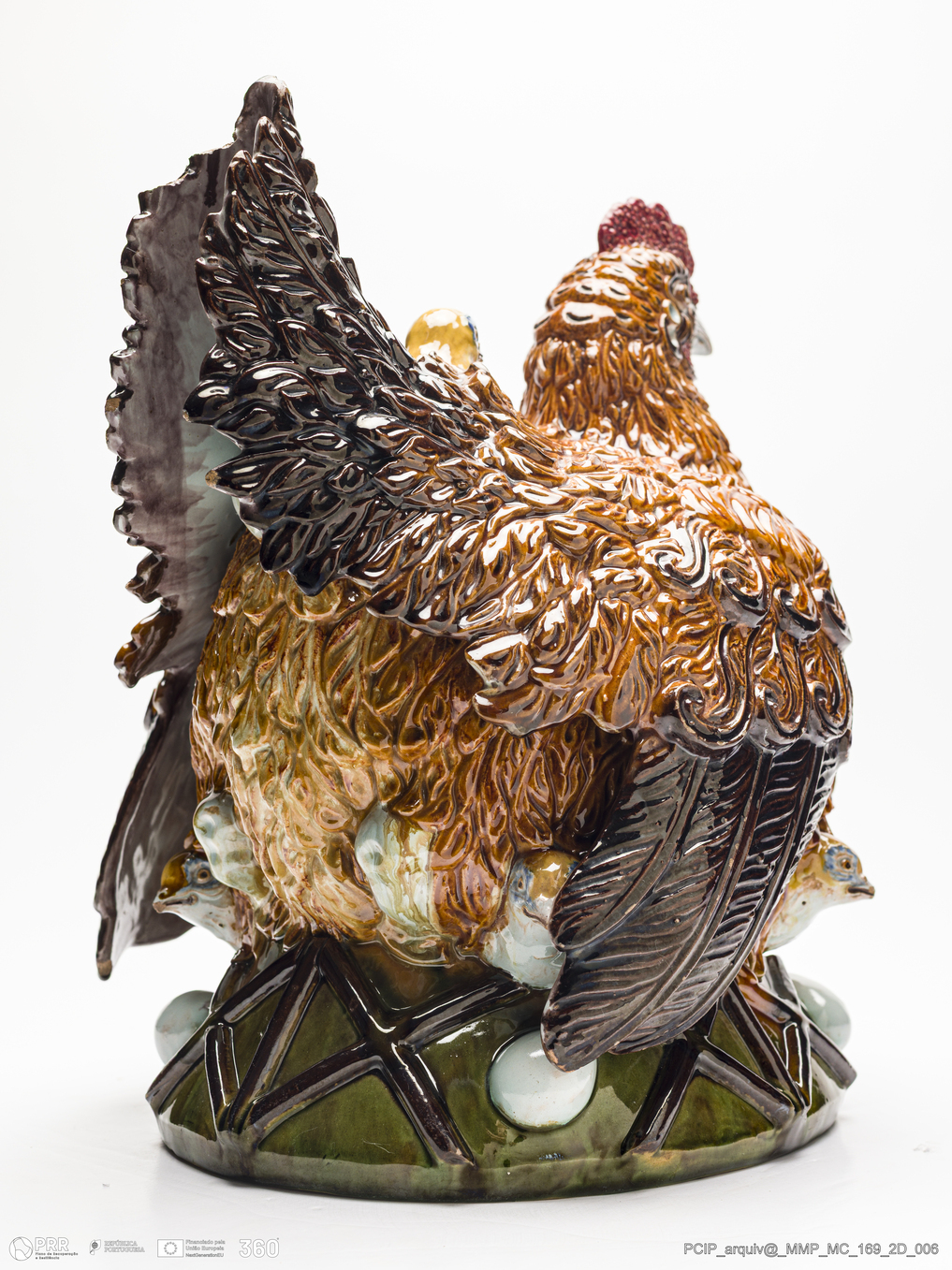 Matéria/Técnica: Barro branco moldado. Vidrado polícromo: preto, vermelho, castanho escuro e mel, branco e verde; Cronologia: 1906; Autoria: Manuel Gustavo Bordalo Pinheiro / Fábrica de Faianças das Caldas da Rainha; Dimensões (cm): Altura: 34,5; Largura: 31,5; Comprimento: 27.