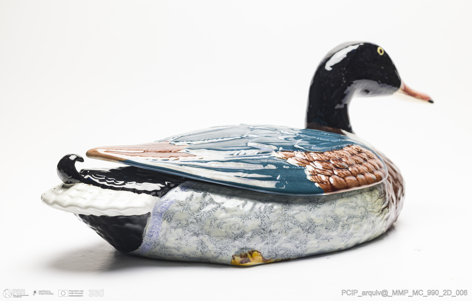 Matéria/Técnica: Pasta de faiança feldspática executada a barbotina; Cronologia: século XX cerca 1980; Autoria: Desconhecido / Fábrica Secla, Caldas da Rainha, Portugal; Dimensões (cm): Altura: 19; Largura: 21; Comprimento: 45.