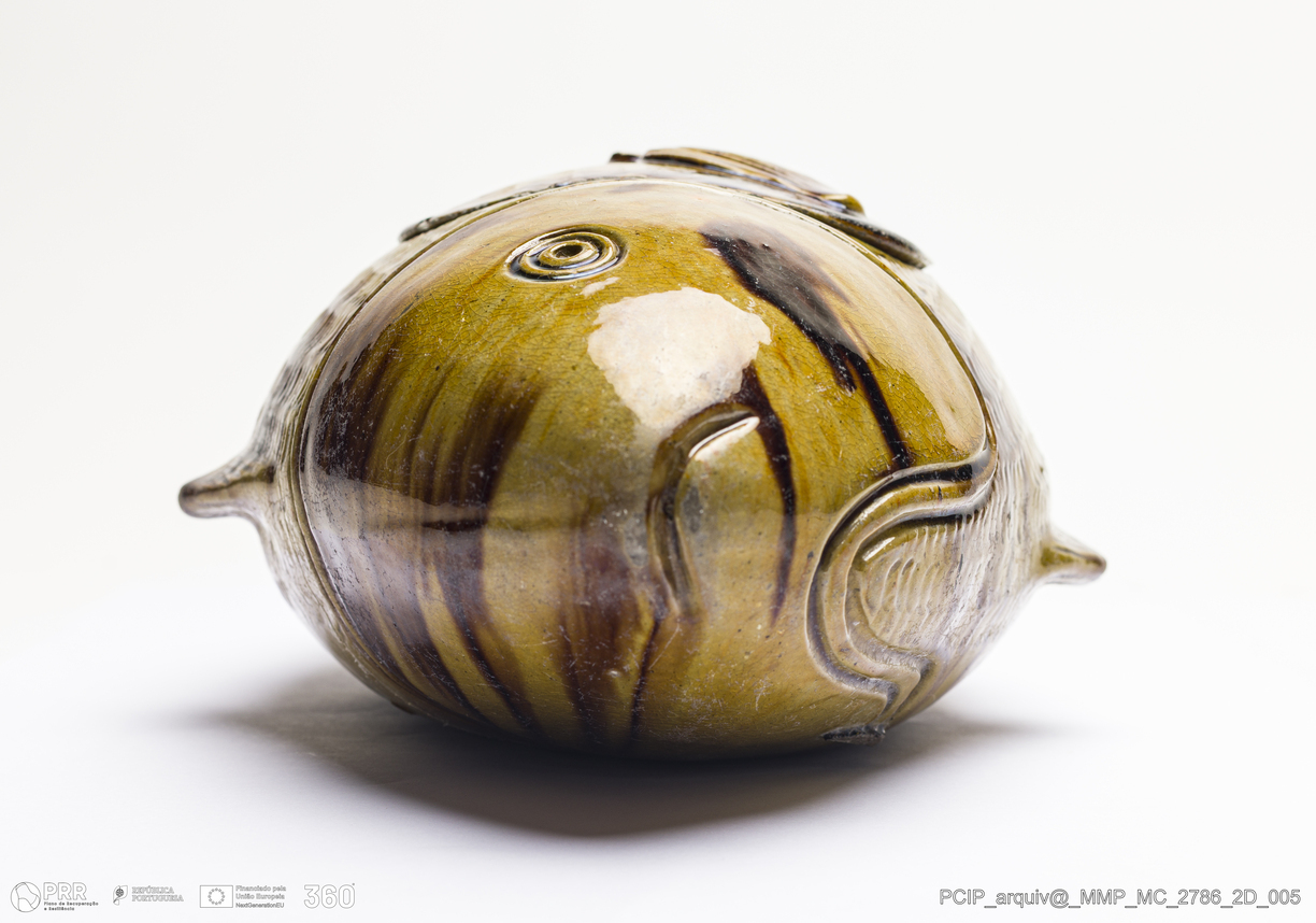 Matéria/Técnica: Barro moldado e modelado. Vidrado polícromo castanho, verde sobre fundo creme; Cronologia: século XIX; Autoria: Desconhecido / Caldas da Rainha, Portugal; Dimensões (cm): Altura: 11; Largura: 18; Comprimento: 31.