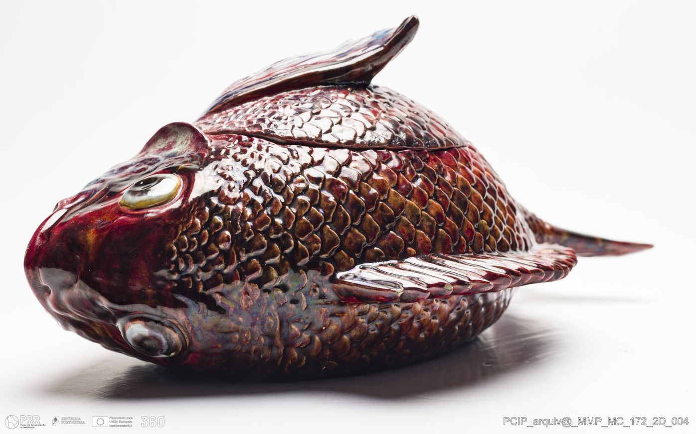 Matéria/Técnica: Barro vermelho moldado. Vidrado polícromo: preto, vermelho, azul, cinzento e branco; Cronologia: 1906; Autoria: Rafael Bordalo Pinheiro / Fábrica de Faianças das Caldas da Rainha, Portugal; Dimensões (cm): Altura: 18; Largura: 43,5; Comprimento: 23.