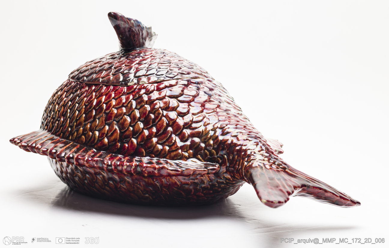 Matéria/Técnica: Barro vermelho moldado. Vidrado polícromo: preto, vermelho, azul, cinzento e branco; Cronologia: 1906; Autoria: Rafael Bordalo Pinheiro / Fábrica de Faianças das Caldas da Rainha, Portugal; Dimensões (cm): Altura: 18; Largura: 43,5; Comprimento: 23.