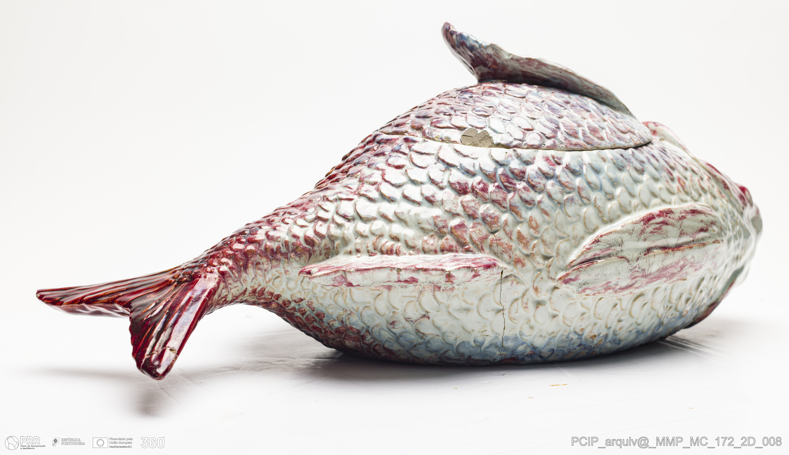 Matéria/Técnica: Barro vermelho moldado. Vidrado polícromo: preto, vermelho, azul, cinzento e branco; Cronologia: 1906; Autoria: Rafael Bordalo Pinheiro / Fábrica de Faianças das Caldas da Rainha, Portugal; Dimensões (cm): Altura: 18; Largura: 43,5; Comprimento: 23.