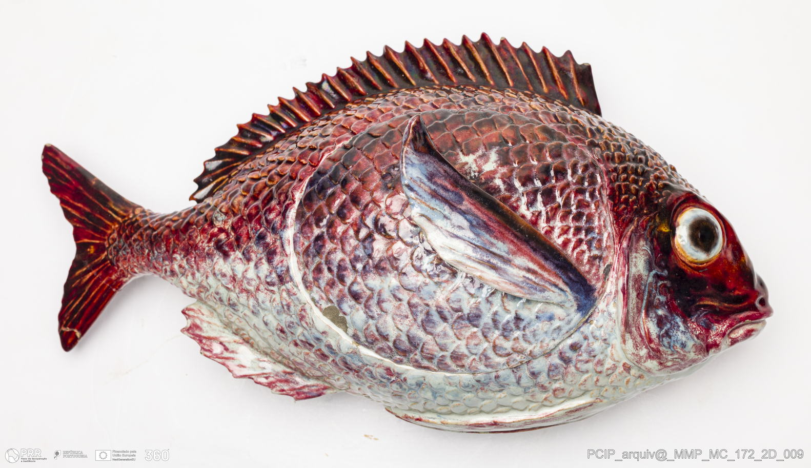 Matéria/Técnica: Barro vermelho moldado. Vidrado polícromo: preto, vermelho, azul, cinzento e branco; Cronologia: 1906; Autoria: Rafael Bordalo Pinheiro / Fábrica de Faianças das Caldas da Rainha, Portugal; Dimensões (cm): Altura: 18; Largura: 43,5; Comprimento: 23.