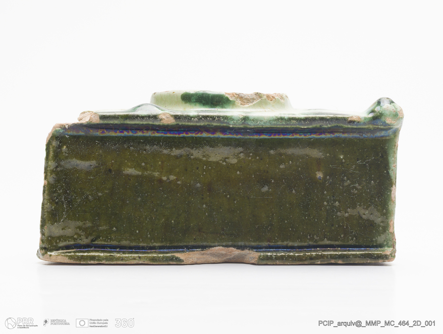 Matéria/Técnica: Barro vermelho modelado. Vidrado policomo: verde e camurça; Cronologia: século XIX; Autoria: Desconhecido / Caldas da Rainha, Portugal; Dimensões (cm): Altura: 5; Largura: 11; Comprimento: 11.