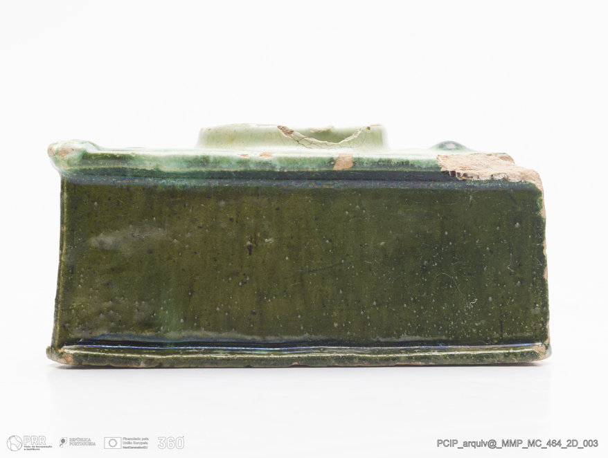 Matéria/Técnica: Barro vermelho modelado. Vidrado policomo: verde e camurça; Cronologia: século XIX; Autoria: Desconhecido / Caldas da Rainha, Portugal; Dimensões (cm): Altura: 5; Largura: 11; Comprimento: 11.