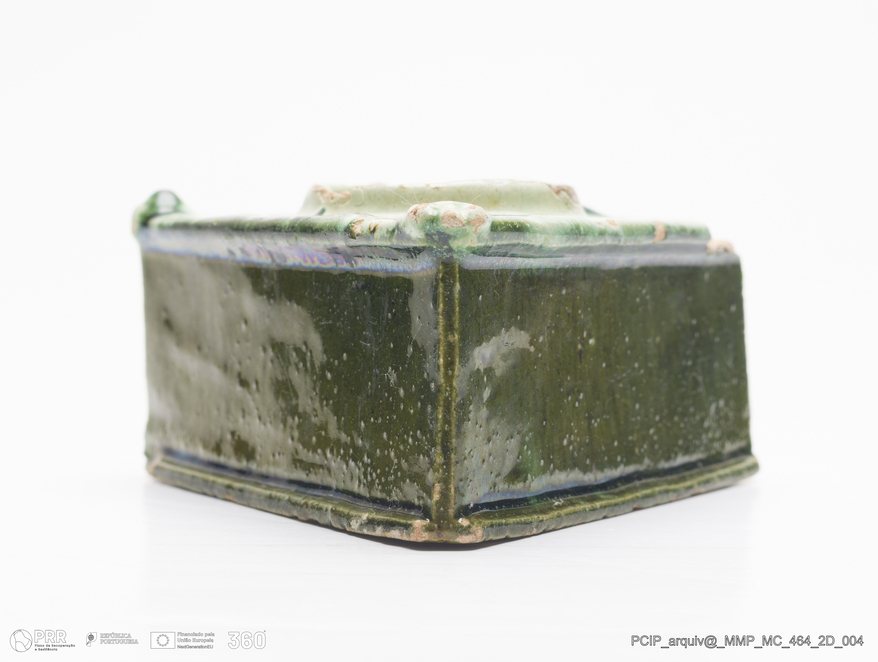 Matéria/Técnica: Barro vermelho modelado. Vidrado policomo: verde e camurça; Cronologia: século XIX; Autoria: Desconhecido / Caldas da Rainha, Portugal; Dimensões (cm): Altura: 5; Largura: 11; Comprimento: 11.