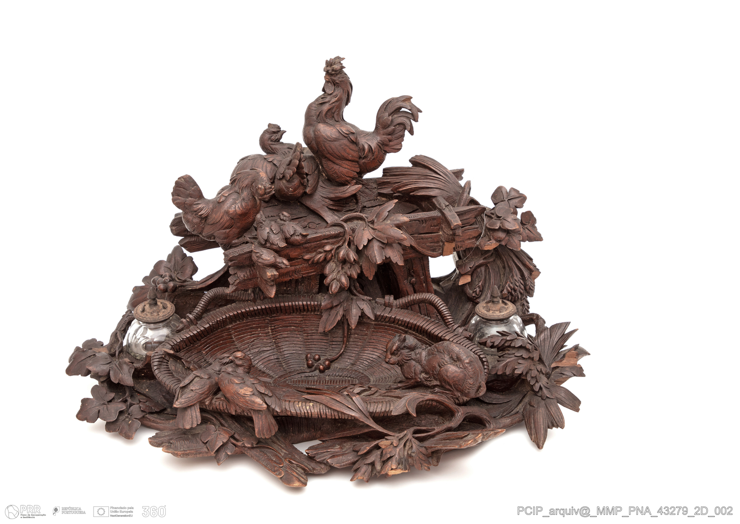 Matéria/Técnica: Madeira de tília ou nogueira (?), metal e vidro; Cronologia: Século XIX; Autoria: Desconhecida; Dimensões (cm): Altura: 28; Largura: 50; Profundidade: 40.