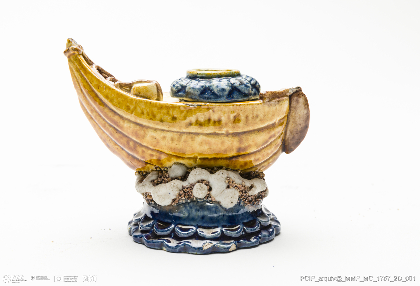 Matéria/Técnica: Barro branco moldado. Vidrado polícromo castanho escuro e mel, azul e camurça; Cronologia: 1902-1925; Autoria: António Alves Cunha, Caldas da Rainha; Dimensões (cm): Altura: 7,6; Largura: 6; Comprimento: 9.