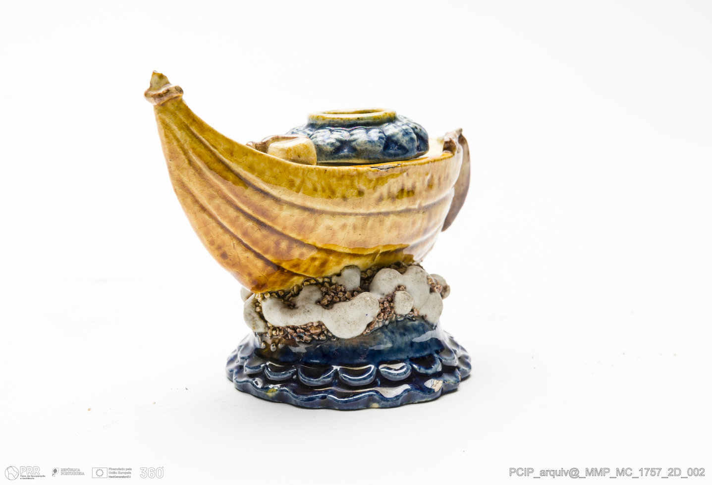 Matéria/Técnica: Barro branco moldado. Vidrado polícromo castanho escuro e mel, azul e camurça; Cronologia: 1902-1925; Autoria: António Alves Cunha, Caldas da Rainha; Dimensões (cm): Altura: 7,6; Largura: 6; Comprimento: 9.