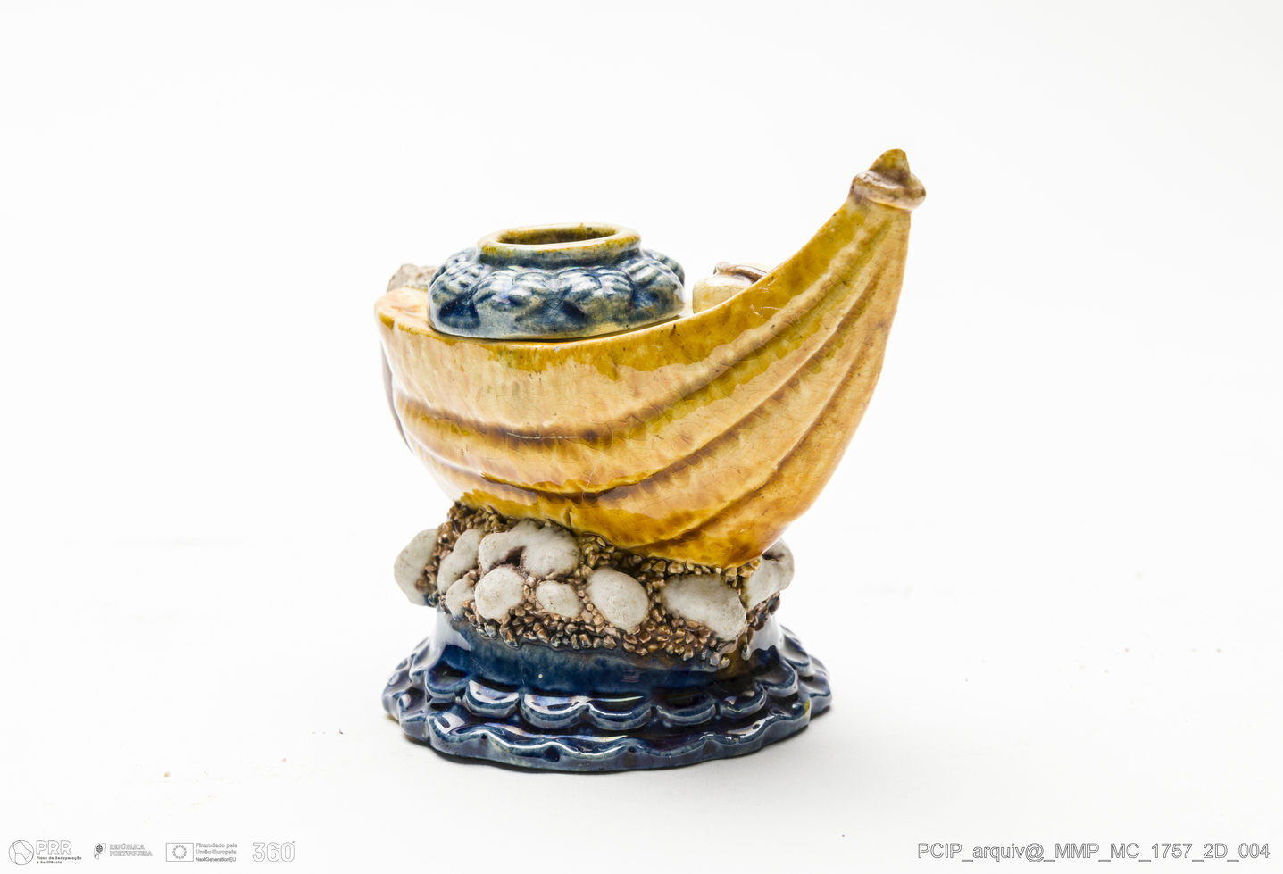Matéria/Técnica: Barro branco moldado. Vidrado polícromo castanho escuro e mel, azul e camurça; Cronologia: 1902-1925; Autoria: António Alves Cunha, Caldas da Rainha; Dimensões (cm): Altura: 7,6; Largura: 6; Comprimento: 9.