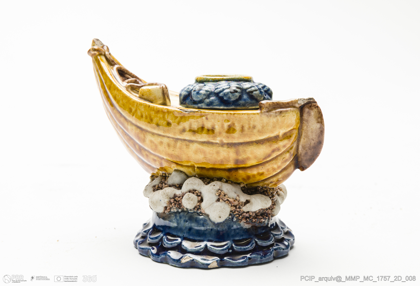 Matéria/Técnica: Barro branco moldado. Vidrado polícromo castanho escuro e mel, azul e camurça; Cronologia: 1902-1925; Autoria: António Alves Cunha, Caldas da Rainha; Dimensões (cm): Altura: 7,6; Largura: 6; Comprimento: 9.