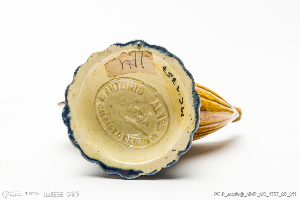 Matéria/Técnica: Barro branco moldado. Vidrado polícromo castanho escuro e mel, azul e camurça; Cronologia: 1902-1925; Autoria: António Alves Cunha, Caldas da Rainha; Dimensões (cm): Altura: 7,6; Largura: 6; Comprimento: 9.