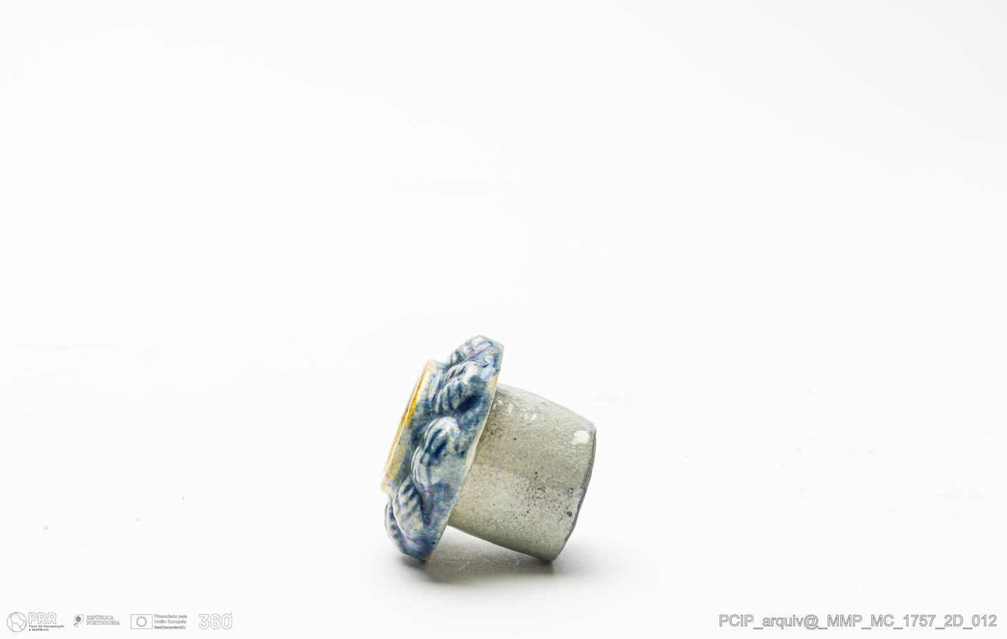 Matéria/Técnica: Barro branco moldado. Vidrado polícromo castanho escuro e mel, azul e camurça; Cronologia: 1902-1925; Autoria: António Alves Cunha, Caldas da Rainha; Dimensões (cm): Altura: 7,6; Largura: 6; Comprimento: 9.