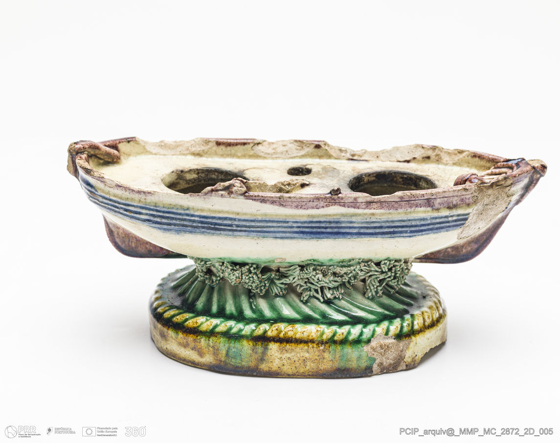 Matéria/Técnica: Barro modelado. Vidrado polícromo: castanho, camurça, azul e beje; Cronologia: 1870-1905; Autoria: Manuel Cipriano Gomes Mafra / Fábrica Manuel Cipriano Gomes O Mafra, Caldas da Rainha, Portugal; Dimensões (cm): Altura: 7,5; Largura: 7,3; Comprimento: 18,3.