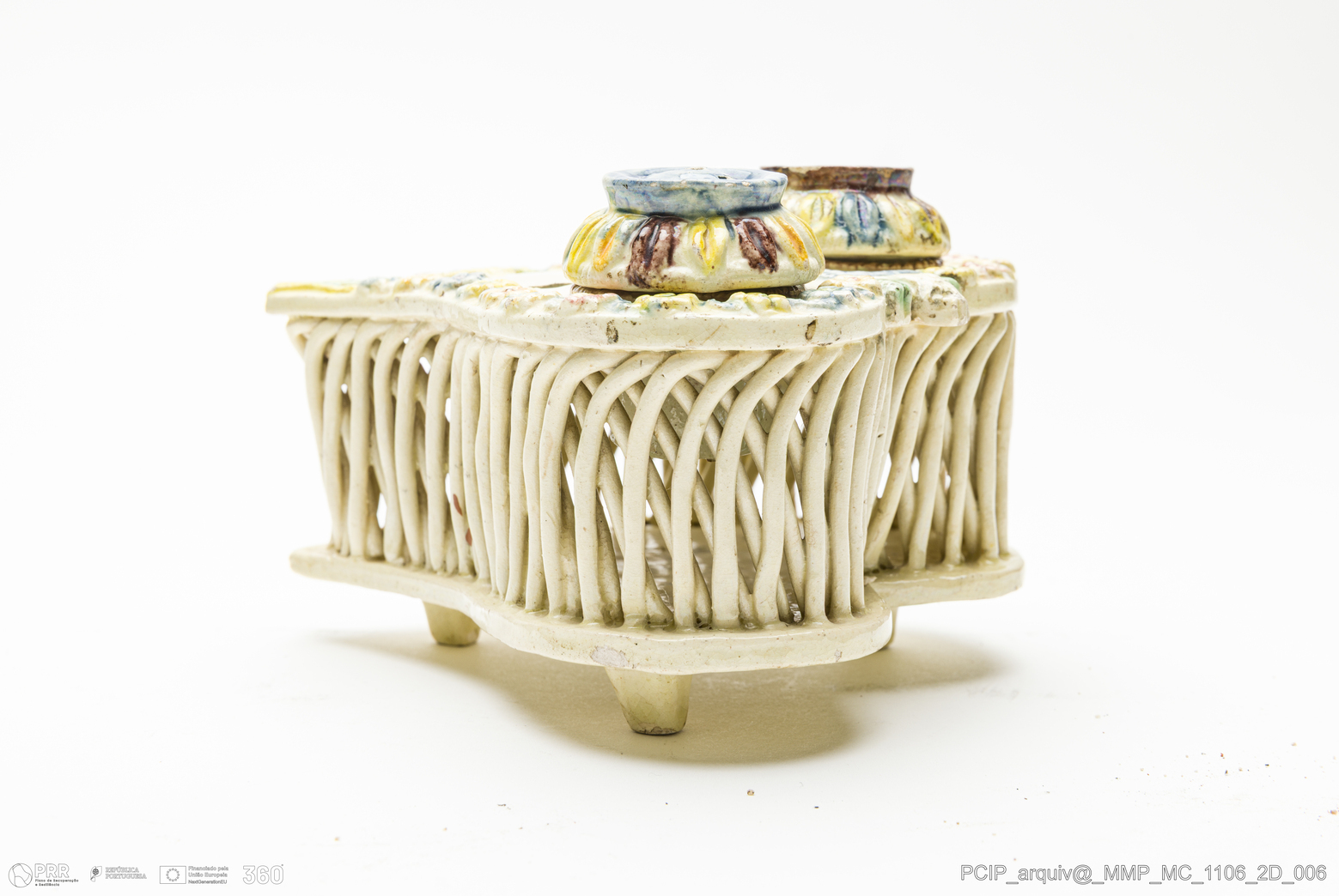 Matéria/Técnica: Barro branco moldado e modelado. Vidrado polícromo: transparente, azul e cobalto, amarelo de ferro, castanho e manganês. Verde de cobre e vermelho; Cronologia: séculos XIX-XX; Autoria: Desconhecido / Caldas da Rainha, Portugal; Dimensões (cm): Altura: 9; Largura: 11,5; Com 13.