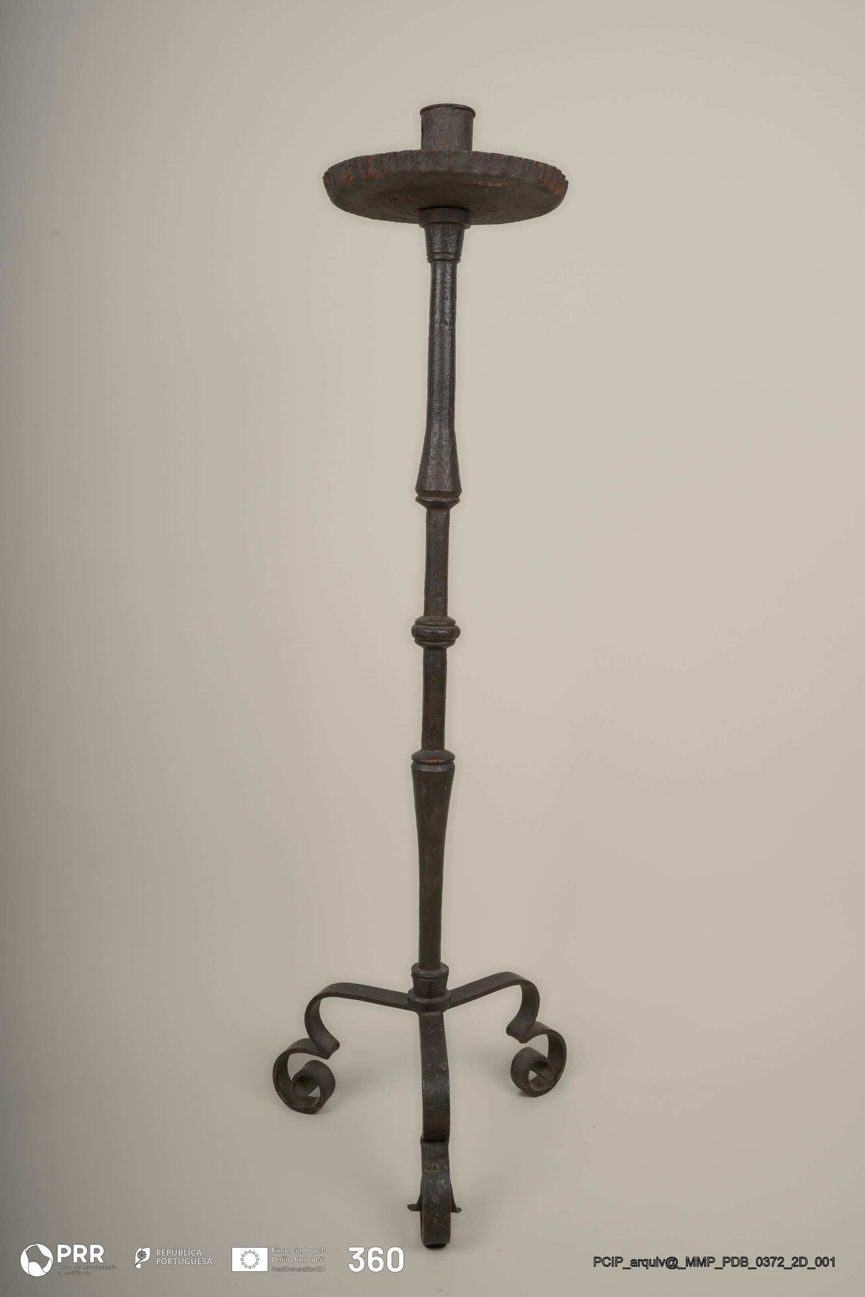 Matéria/Técnica: Desconhecida; Cronologia: Século XVII; Autoria: Desconhecida; Dimensões (cm): Altura: 130; Diâmetro: Prato - 28,6 Vela - 5,7.