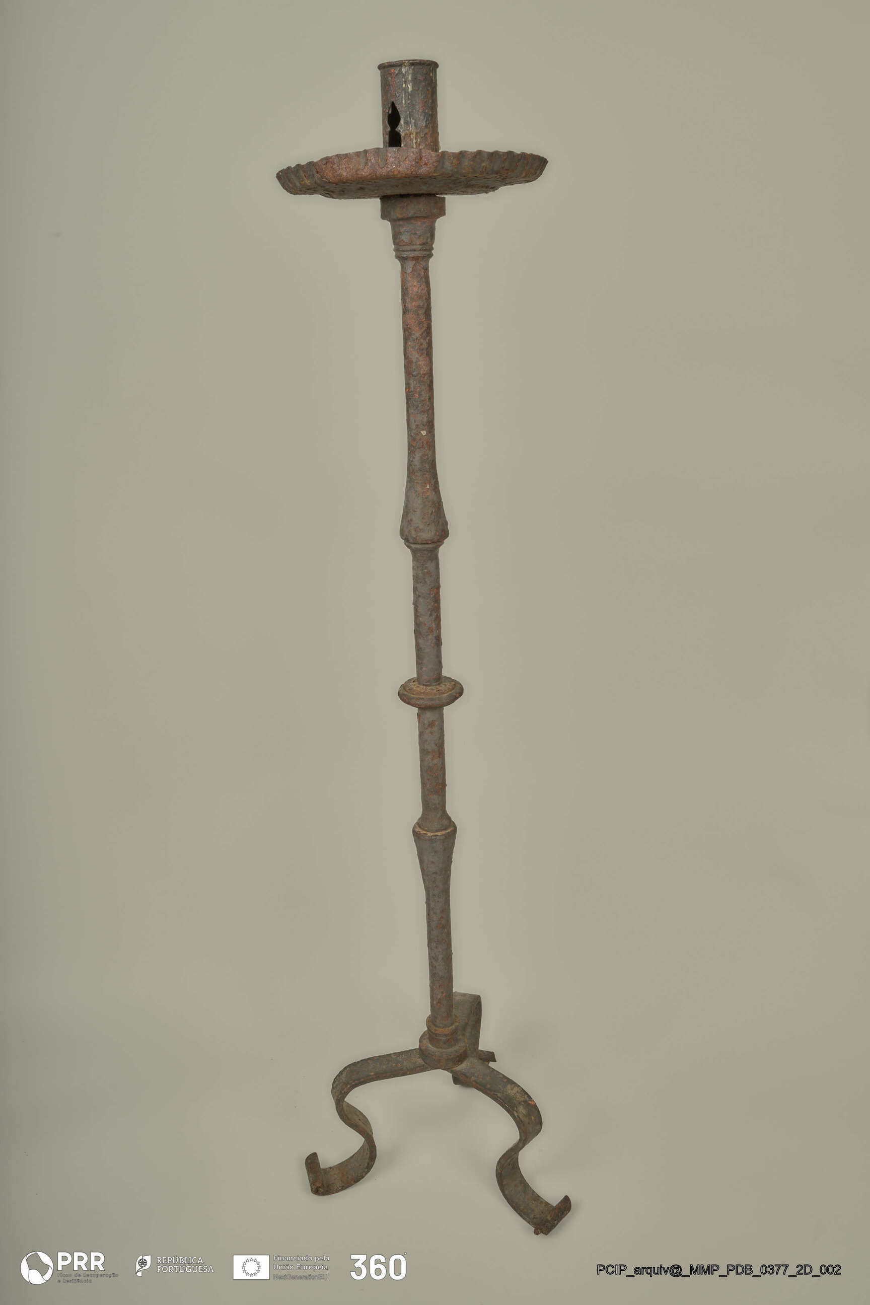 Matéria/Técnica: Desconhecida; Cronologia: Século XVII; Autoria: Desconhecida; Dimensões (cm): Altura: 114,3; Diâmetro: Vela - 4,1 Prato - 22,5.
