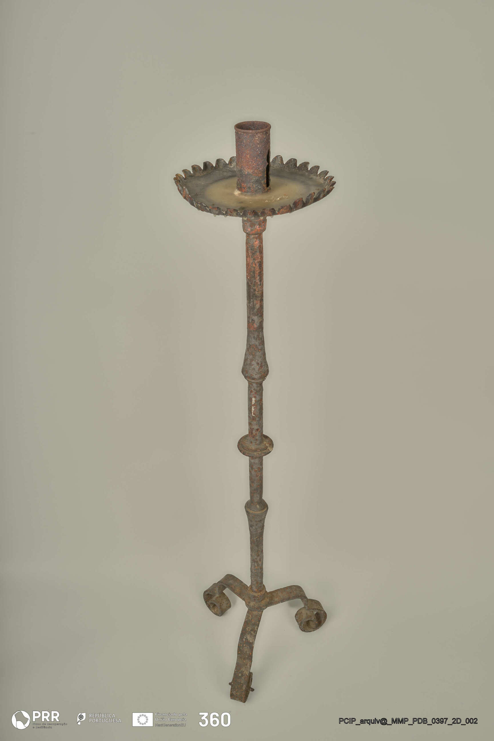 Matéria/Técnica: Desconhecida; Cronologia: Século XVII; Autoria: Desconhecida; Dimensões (cm): Altura: 113,5; Diâmetro: Vela - 4,7 Arandela - 22,8.
