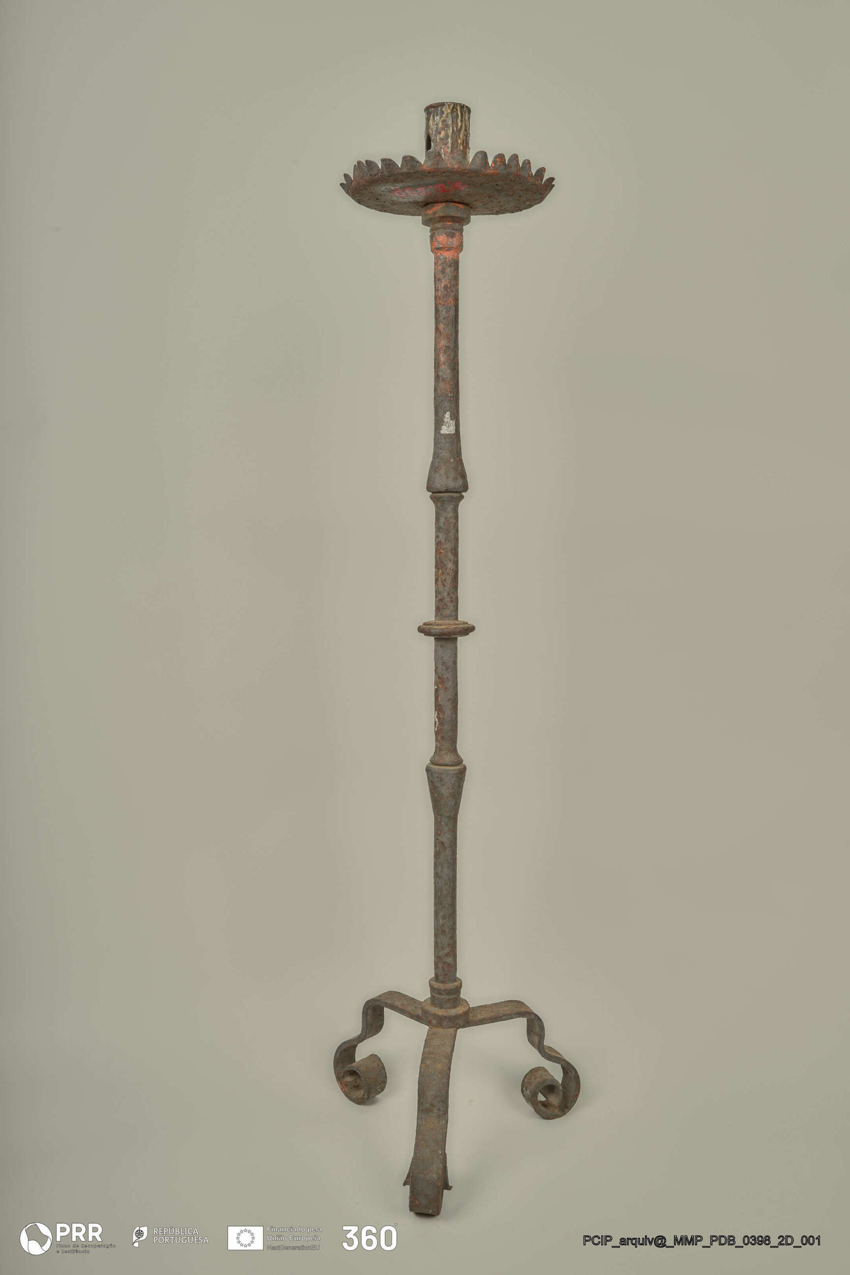 Matéria/Técnica: Desconhecida; Cronologia: Século XVII; Autoria: Desconhecida; Dimensões (cm): Altura: 114,5; Diâmetro: Vela - 4,7 Arandela - 22,6.