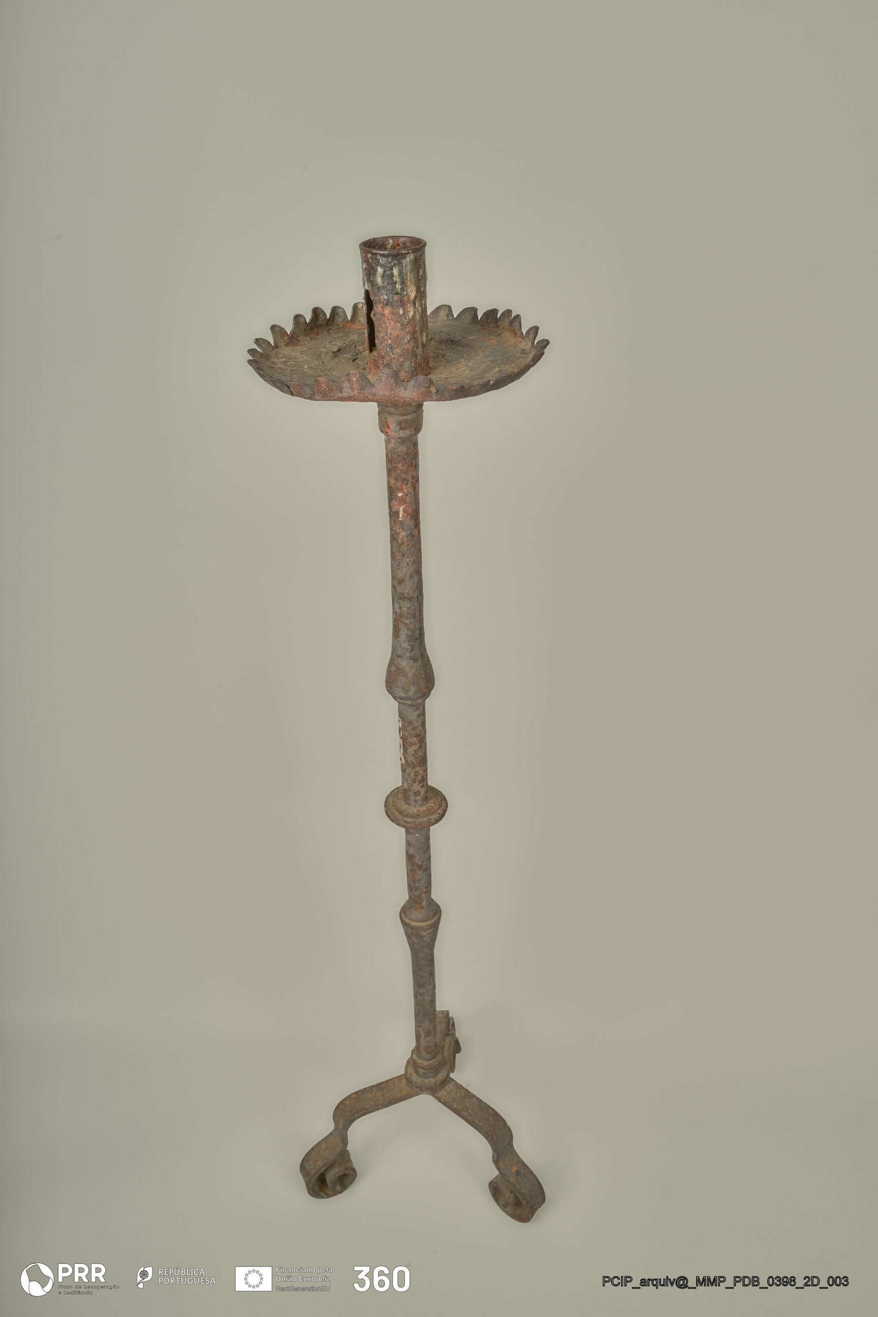 Matéria/Técnica: Desconhecida; Cronologia: Século XVII; Autoria: Desconhecida; Dimensões (cm): Altura: 114,5; Diâmetro: Vela - 4,7 Arandela - 22,6.