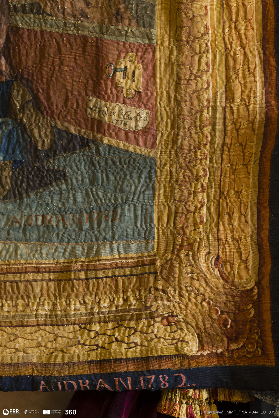 Matéria/Técnica: Tapeçaria de liço; Cronologia: 1782; Autoria: Audran, Jean ; Loo, Amédée Van; Tessier, Louis; Dimensões: Altura: 383 cm x Largura: 405 cm.