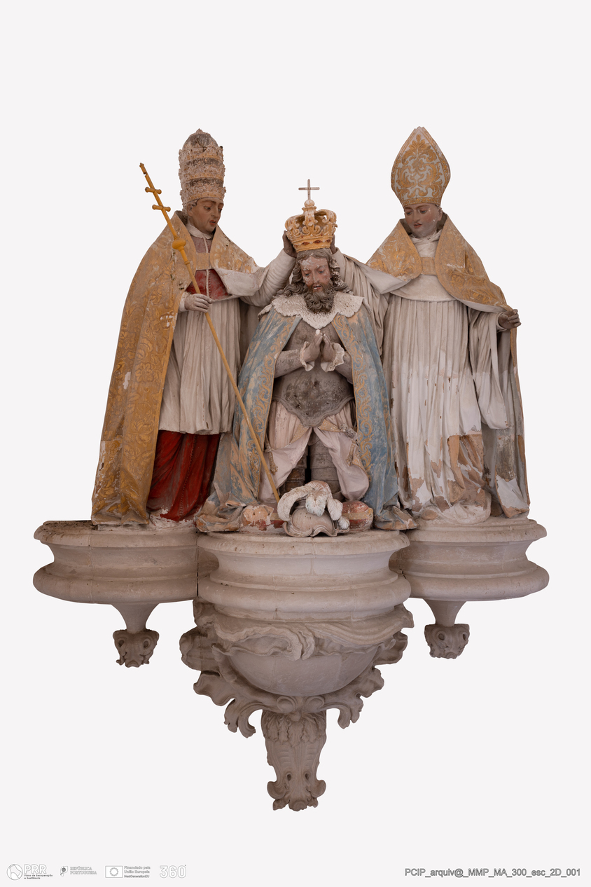 Matéria/Técnica: construção das esculturas com a sobreposição de tacelos dourados e policromados; Cronologia: 1683-1765; Autoria: Desconhecida; Dimensões: Altura: c. 160 cm.