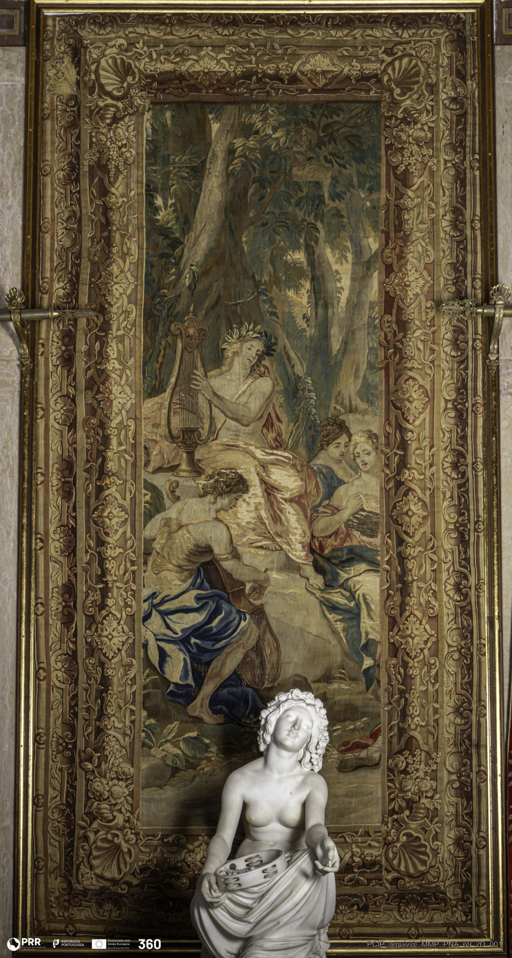 Matéria/Técnica: Tapeçaria de liço; Cronologia: 1728-1729; Autoria: Coppens, Augustin; Leyniers, Urbanus; Orley, Jan Van; Dimensões: Altura: 424 cm x Largura: 200 cm.
