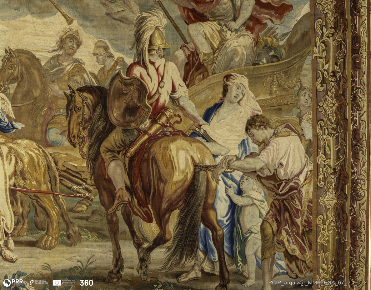 Matéria/Técnica: Tapeçaria de liço; Cronologia: 1728-1729; Autoria: Coppens, Augustin; Leyniers, Urbanus; Orley, Jan Van; Dimensões: Altura: 421 cm x Largura: 391 cm.