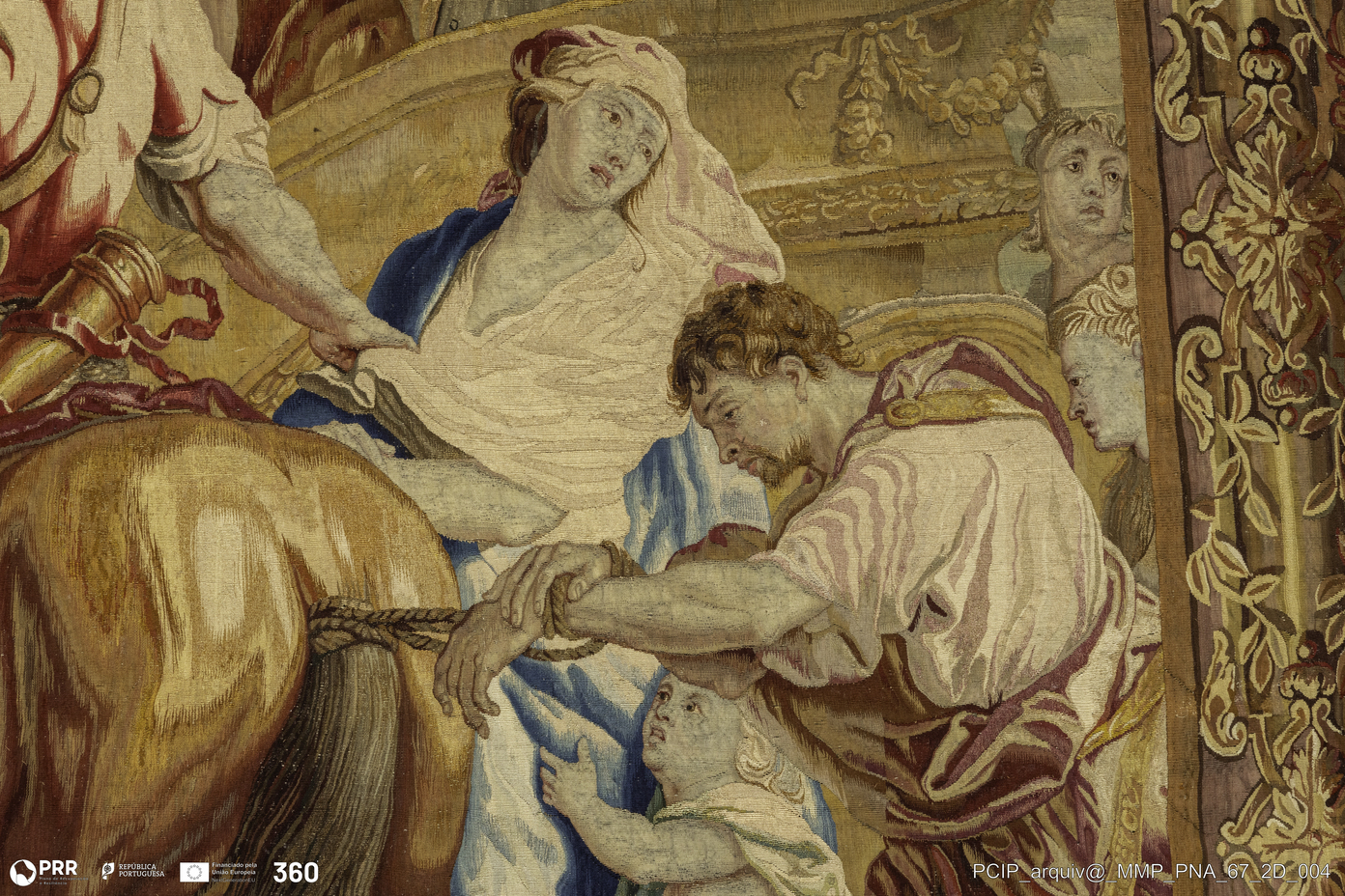 Matéria/Técnica: Tapeçaria de liço; Cronologia: 1728-1729; Autoria: Coppens, Augustin; Leyniers, Urbanus; Orley, Jan Van; Dimensões: Altura: 421 cm x Largura: 391 cm.