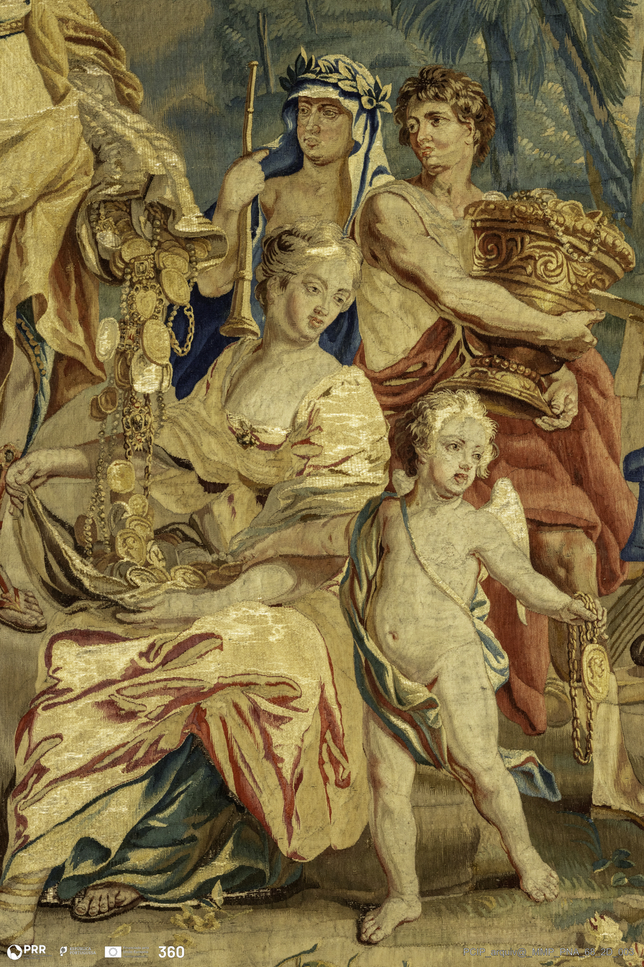 Matéria/Técnica: Tapeçaria de liço; Cronologia: 1728-1729; Autoria: Coppens, Augustin; Leyniers, Urbanus; Orley, Jan Van; Dimensões: Altura: 416,5 cm x Largura: 386,5 cm.