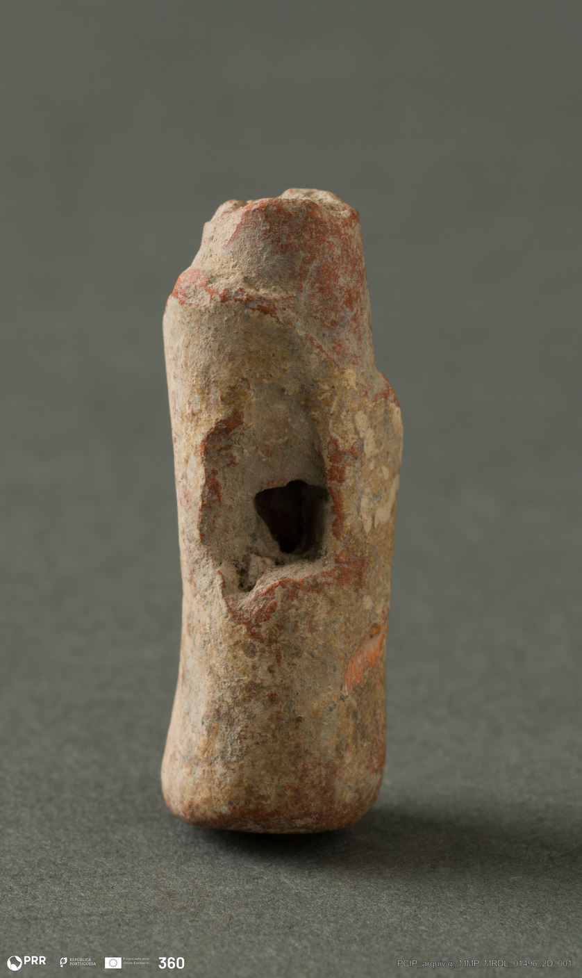 Matéria/Técnica: Barro; Cronologia: Desconhecida; Autoria: Desconhecida; Dimensões: Diâmetro: 1,60 cm; Comprimento: 4,30 cm.