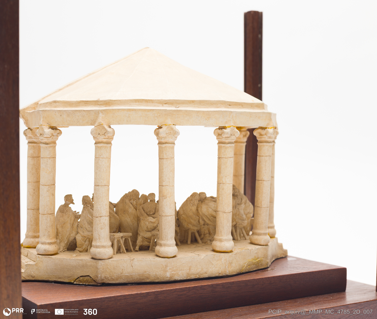 Matéria/Técnica: Barro branco. Escultura de vulto em miniatura; Cronologia: 1920; Autoria: Eduardo Mafra Elias / Fábrica Eduardo Elias, Caldas da Rainha, Portugal; Dimensões (cm): Altura: 20; Largura: 11; Comprimento: 24; Caixa: 30x35x22.
