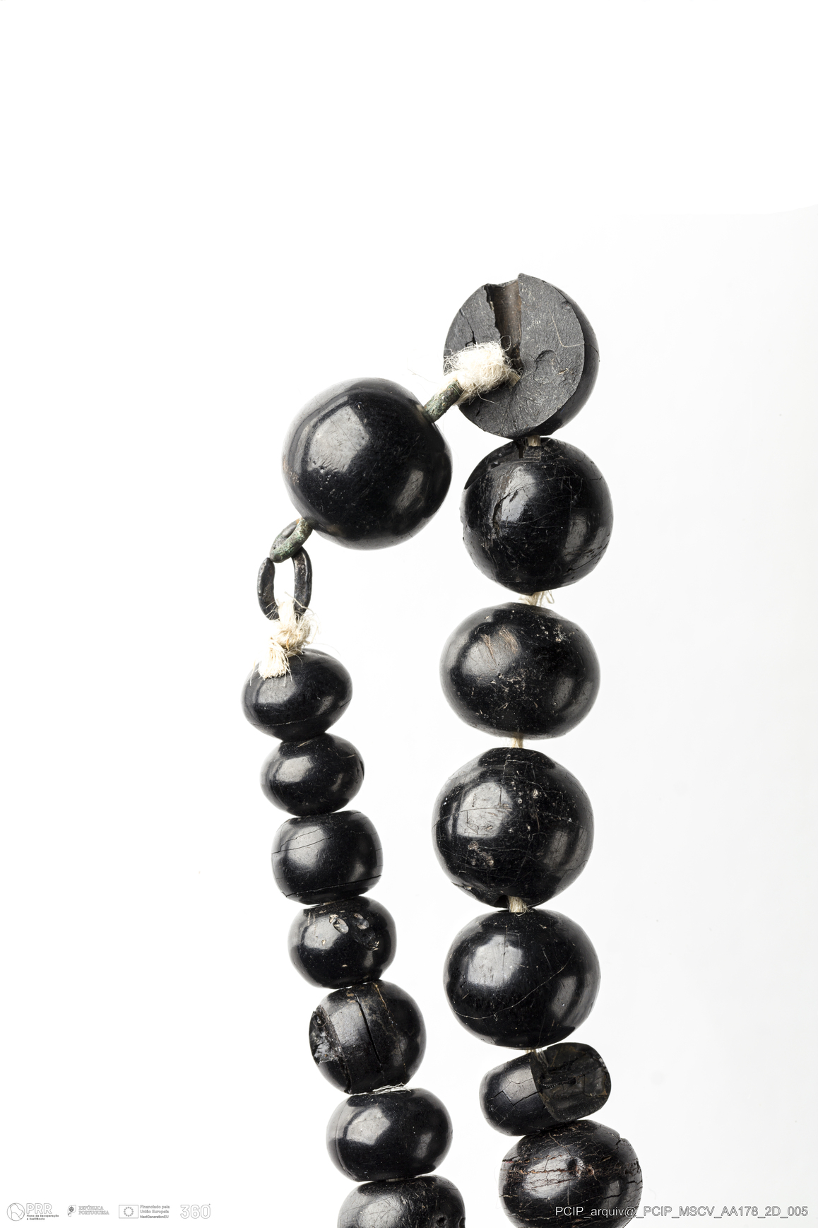 Matéria/Técnica: Azeviche; Cronologia: Século XVI-Século XVII; Autoria: Desconhecida; Dimensões: Diâmetro colar: 110mm; Diâmetro de uma conta inteira: 13mm.