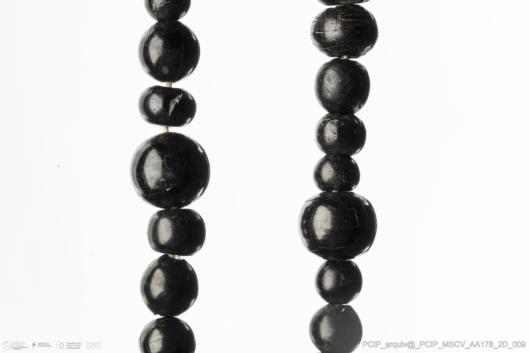 Matéria/Técnica: Azeviche; Cronologia: Século XVI-Século XVII; Autoria: Desconhecida; Dimensões: Diâmetro colar: 110mm; Diâmetro de uma conta inteira: 13mm.