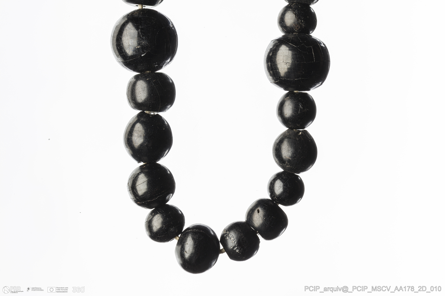 Matéria/Técnica: Azeviche; Cronologia: Século XVI-Século XVII; Autoria: Desconhecida; Dimensões: Diâmetro colar: 110mm; Diâmetro de uma conta inteira: 13mm.