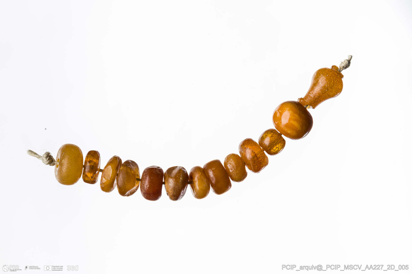 Matéria/Técnica: Âmbar; Cronologia: Século XVI-Século XVII; Autoria: Desconhecida; Dimensões: Comprimento total: 90mm; Diâmetro de uma conta: 10mm.