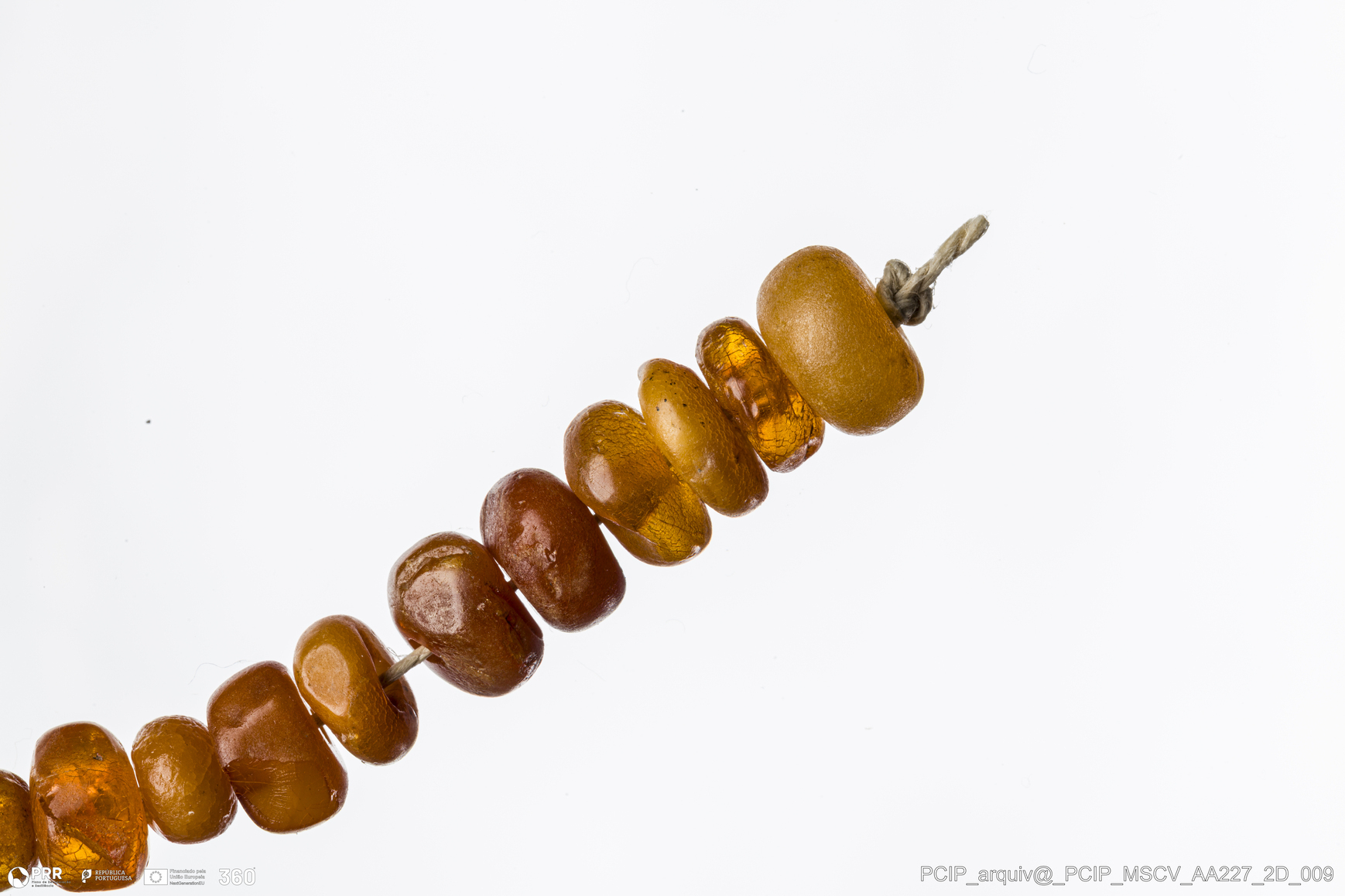 Matéria/Técnica: Âmbar; Cronologia: Século XVI-Século XVII; Autoria: Desconhecida; Dimensões: Comprimento total: 90mm; Diâmetro de uma conta: 10mm.