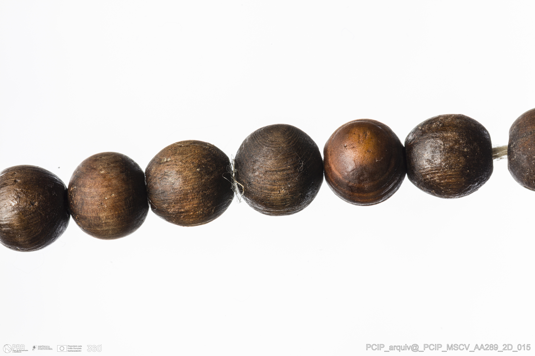 Matéria/Técnica: Madeira; Cronologia: Século XVI-Século XVII; Autoria: Desconhecida; Dimensões: Comprimento total: 140mm; Diâmetro uma conta do AA289: 11,5mm; Diâmetro uma conta AA290: 14,5mm.