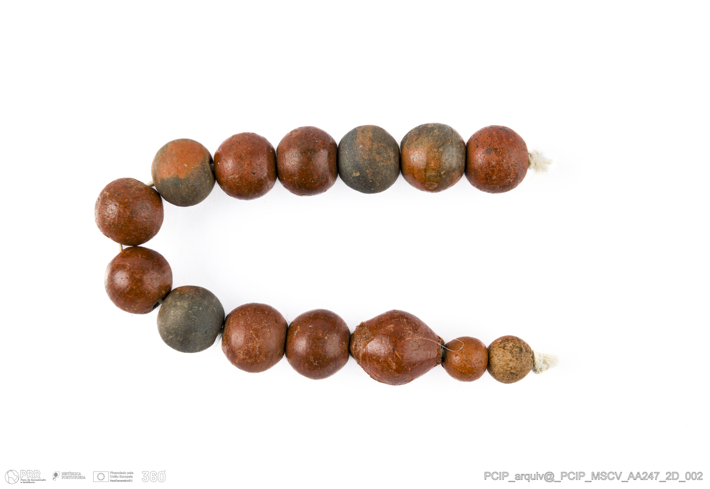 Matéria/Técnica: Terracota; Cronologia: Século XVI-Século XVII; Autoria: Desconhecida; Dimensões: Comprimento total: 133mm; Diâmetro de uma conta: 11mm.