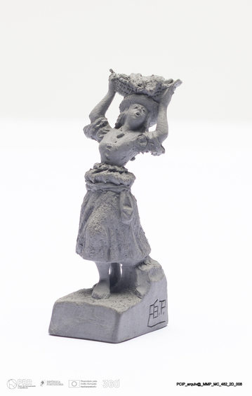 Matéria/Técnica: Barro cinzento modelado. Monocozedura; Cronologia: 1901; Autoria: Francisco Elias / Caldas da Rainha, Portugal; Dimensões (cm): Altura: 5; Largura: 2,5; Comprimento: 2.