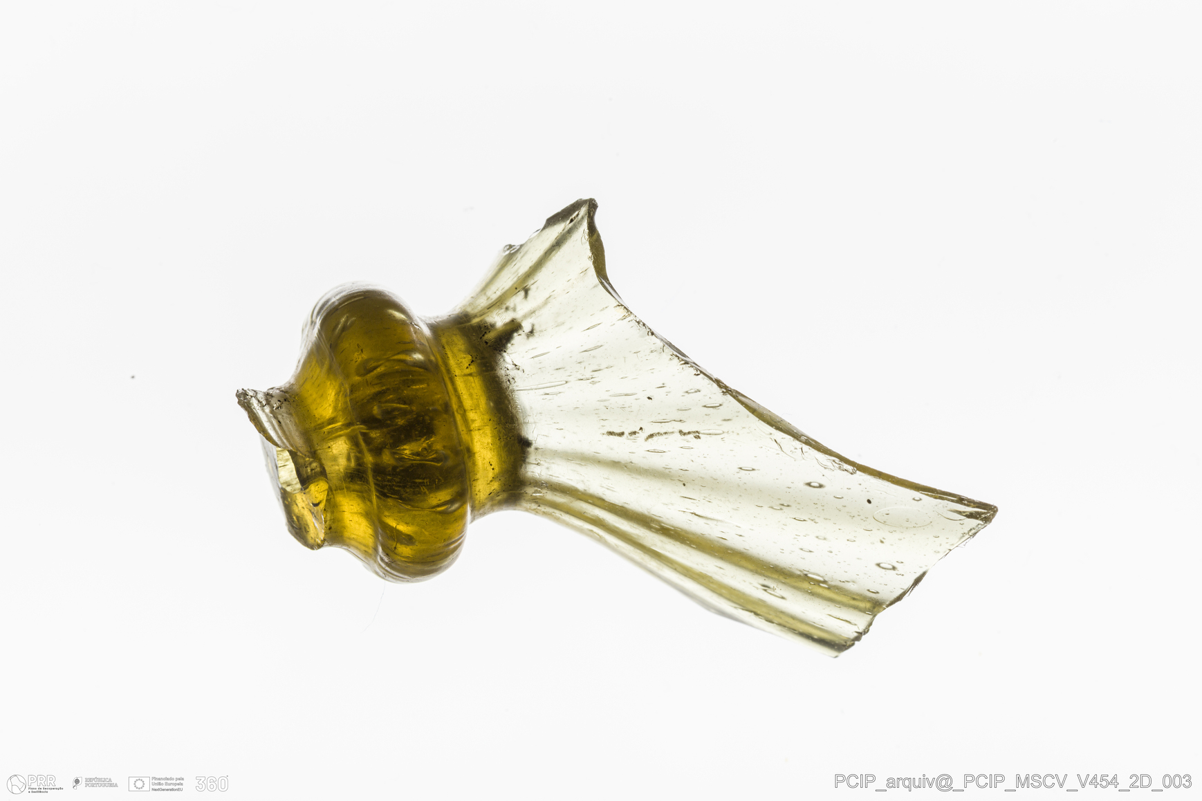Matéria/Técnica: Vidro; Cronologia: Século XVII; Autoria: Desconhecida; Dimensões: Diâmetro: 23mm; Altura: 45mm.