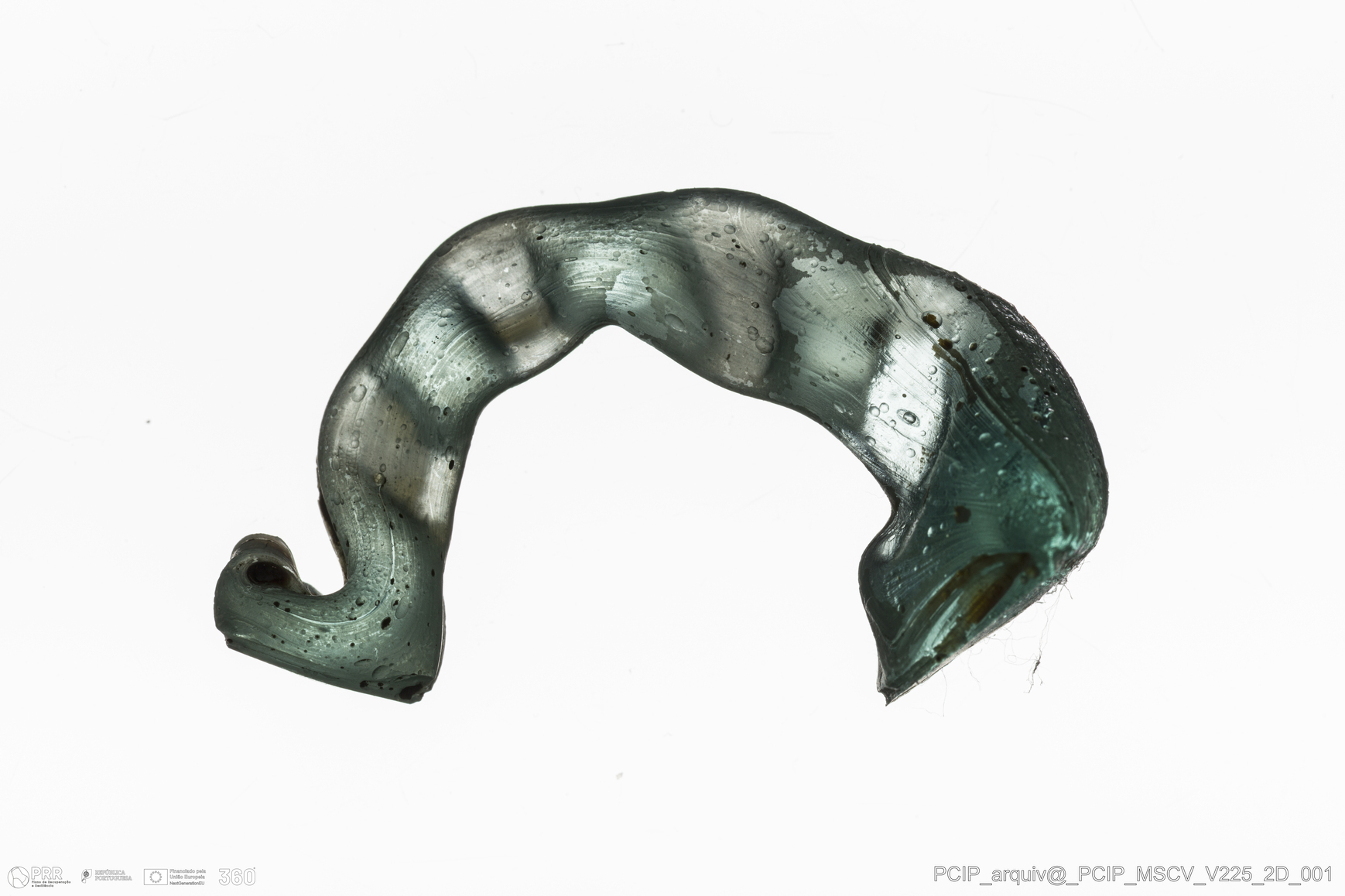 Matéria/Técnica: Vidro; Cronologia: Século XVII; Autoria: Desconhecida; Dimensões: Comprimento: 39mm; Largura: 23mm.