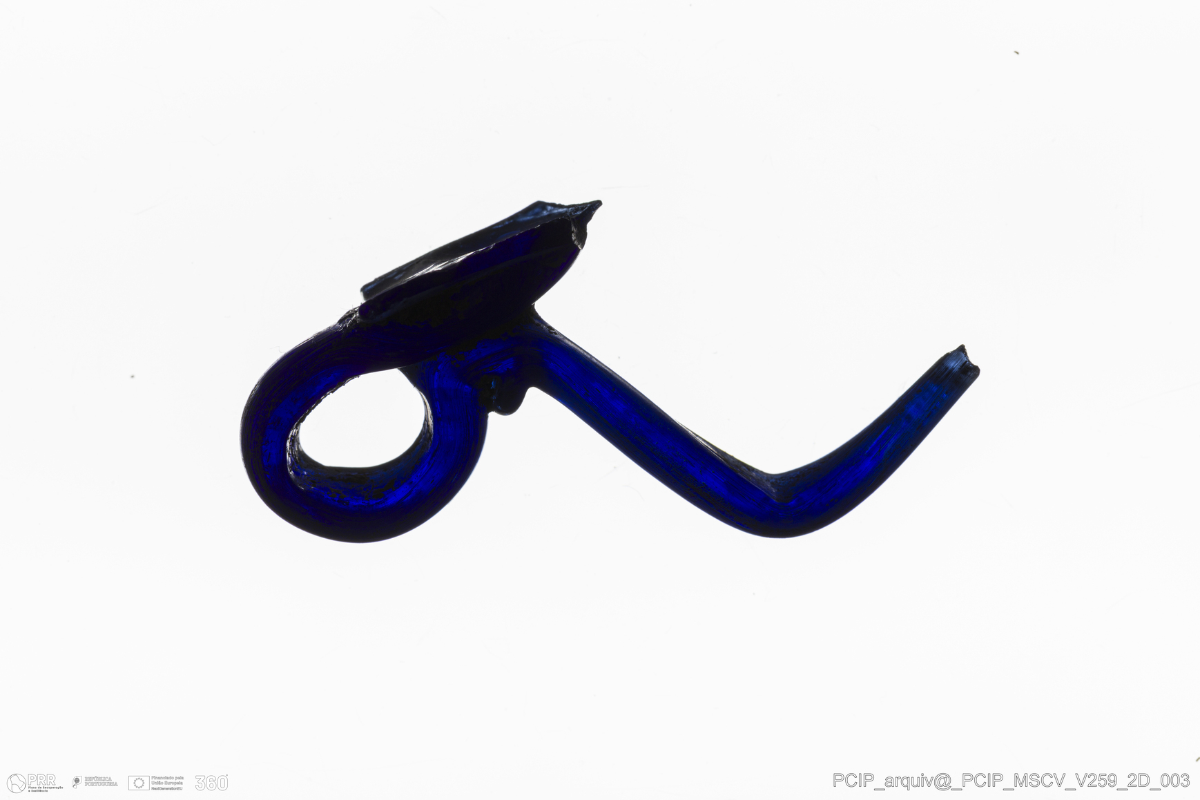 Matéria/Técnica: Vidro; Cronologia: Século XVII; Autoria: Desconhecida; Dimensões: Comprimento: 42mm; Largura: 26mm.