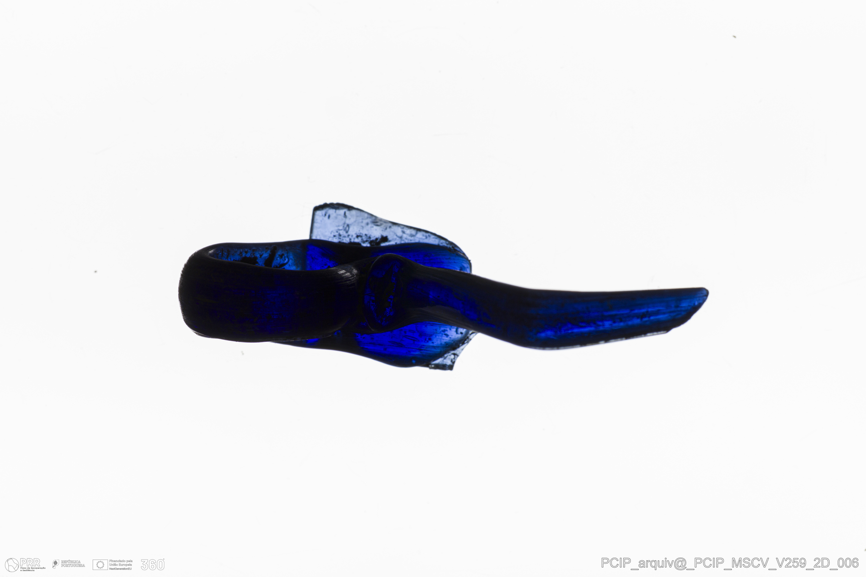 Matéria/Técnica: Vidro; Cronologia: Século XVII; Autoria: Desconhecida; Dimensões: Comprimento: 42mm; Largura: 26mm.