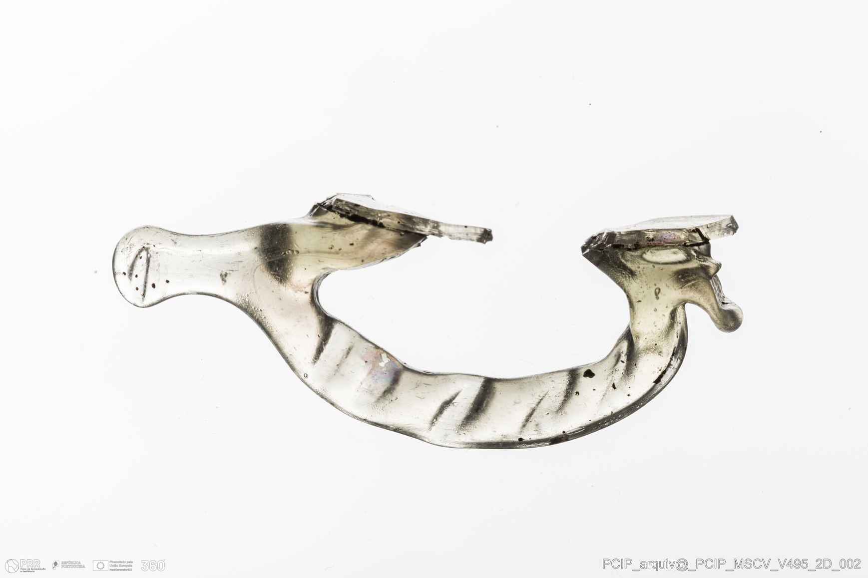 Matéria/Técnica: Vidro; Cronologia: Século XVII; Autoria: Desconhecida; Dimensões: Largura: 22mm; Altura: 55mm.