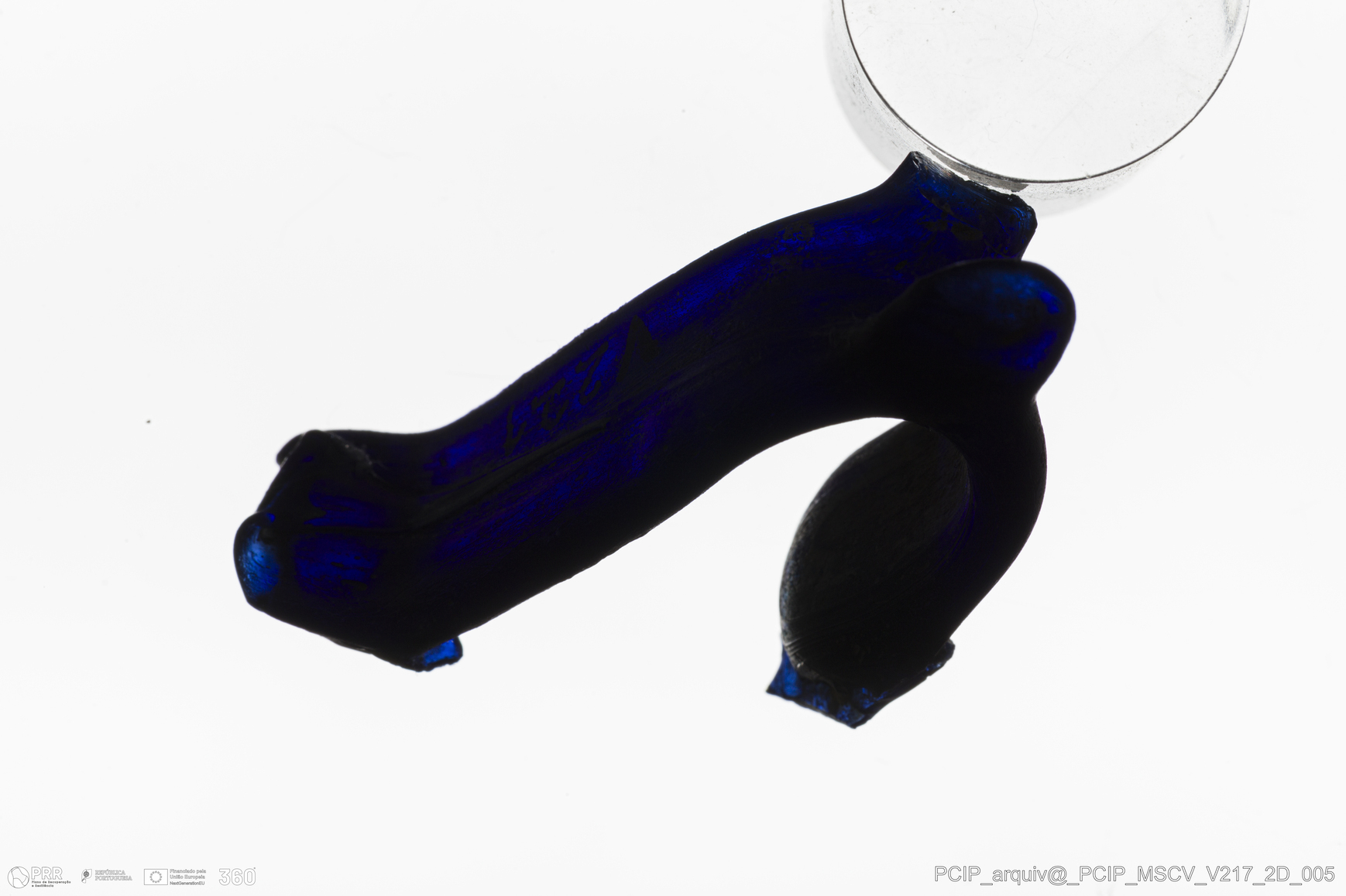 Matéria/Técnica: Vidro; Cronologia: Século XVII; Autoria: Desconhecida; Dimensões: Comprimento: 47mm; Espessura: 14mm.